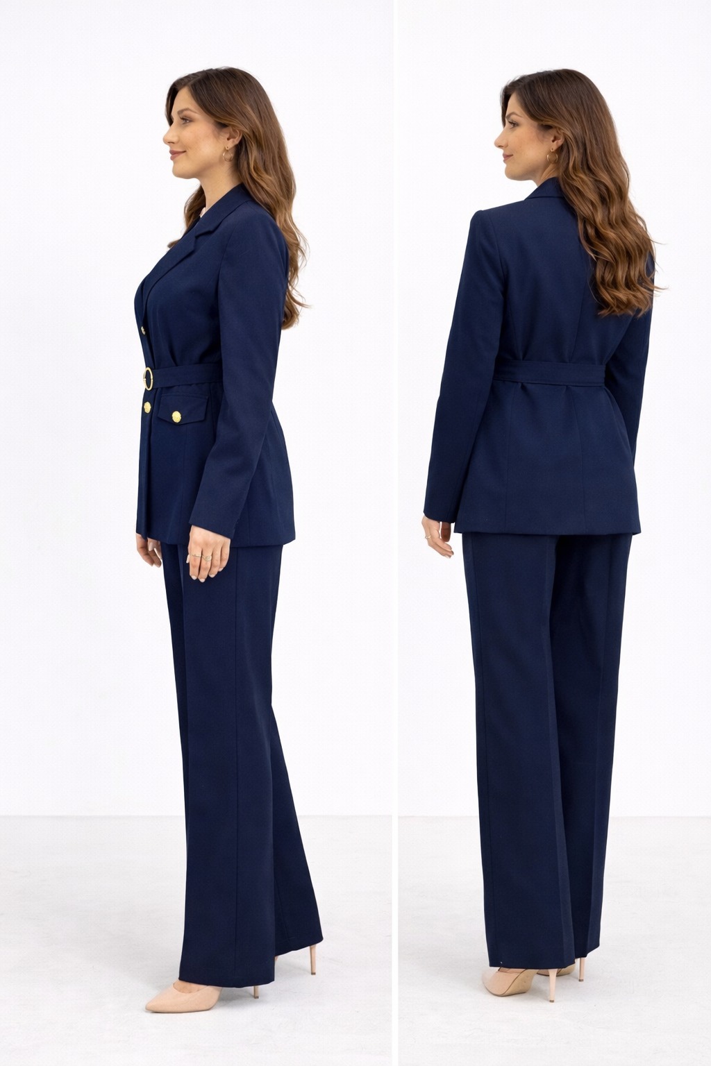 Ensemble tailleur femme composé d’un blazer cintré à col tailleur et d’un pantalon long à coupe droite. Le blazer présente une fermeture boutonnée, une ceinture intégrée avec boucle visible et des poches à rabat ornées de boutons décoratifs. Les manches sont longues et la veste arrive sous les hanches, soulignant la silhouette. L’ensemble est présenté porté sur mannequin en studio, en coloris visibles bleu marine et noir.